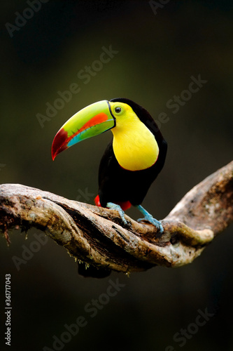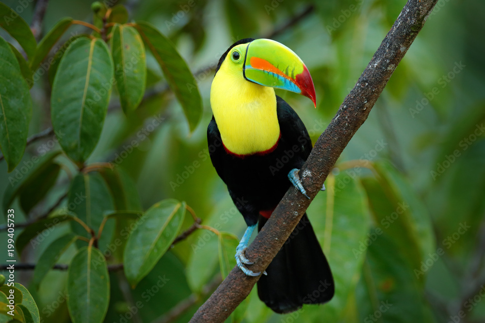 There are six different species of this bird found in costa rica and one of the most stunning is the keel billed toucan. The keel billed toucan latin name ramphastos sulfuratus is most commonly found in tropical forests from mexico to columbia. They have huge multi colored beak that will reach up to 20 cm in length.