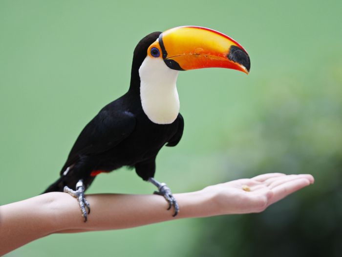 Relative to its body size the toco toucan has the largest bill of any bird in the world. It is an omnivorous forest bird that feeds on fruits seeds insects invertebrates lizards snakes and small birds. The bill reaches fruit on branches that might not be able to support the birds weight.