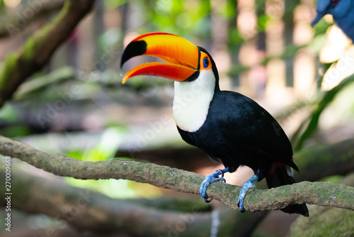 Just like this toucan can opener. Big beak bird chesnut mandibled toucan sitting on the branch in tropical rain with green jungle background. Toco toucan ramphastos toco beak open with tongue visible while feeding on mango brazil.
