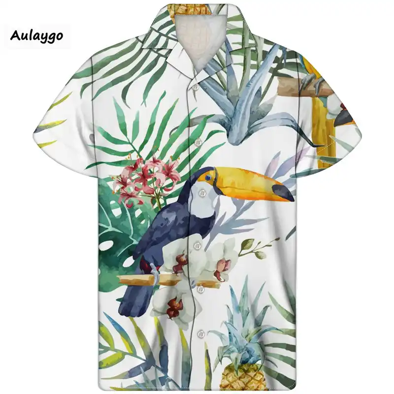 Designer Mens Hawaiian Tropical Green Plant Toucan Printed Short Sleeve Shirt Newchic