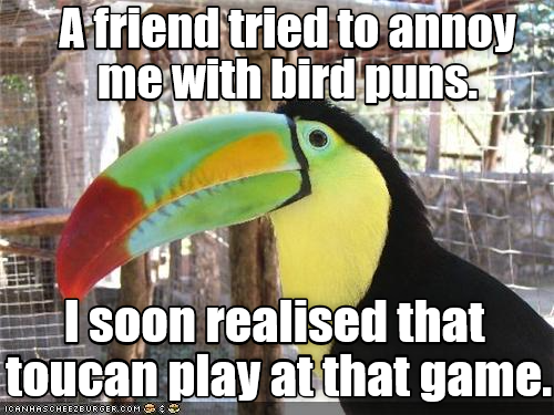 Toucan jokes. A friend of mine tried to annoy me with bird puns but i soon realized that toucan play at that game. I had an animal pun contest today. Why did the toucan stop using his phone.