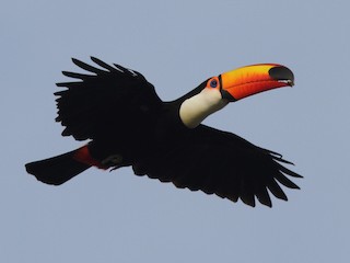 Large and impressive toucan with a huge orange bill with a black tip and base.